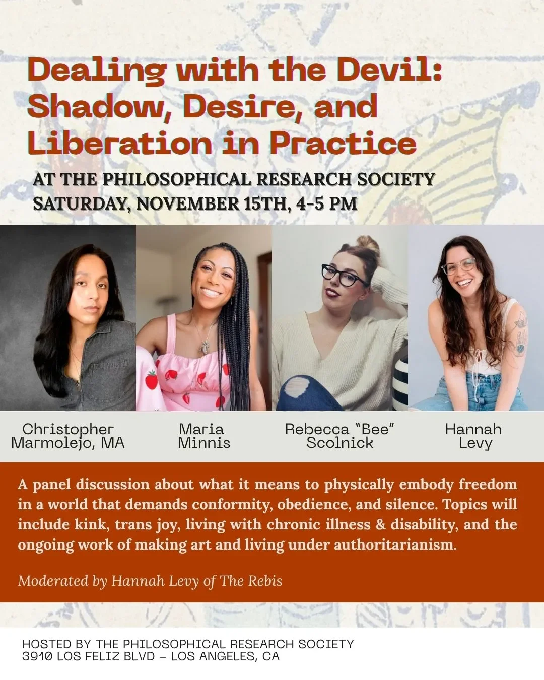 The Devil is a portal into radical honesty and embodiment, so our panelists will get real about how they're working with this archetype in their practices and lives. Topics will include kink, trans joy, living with chronic illness & disability, and the ongoing work of making art and living under authoritarianism.
